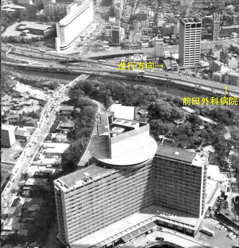 右側に見える白っぽい塔は、麹町通り弘済会館ならびのビル屋上にあった不二サッシ広告塔。