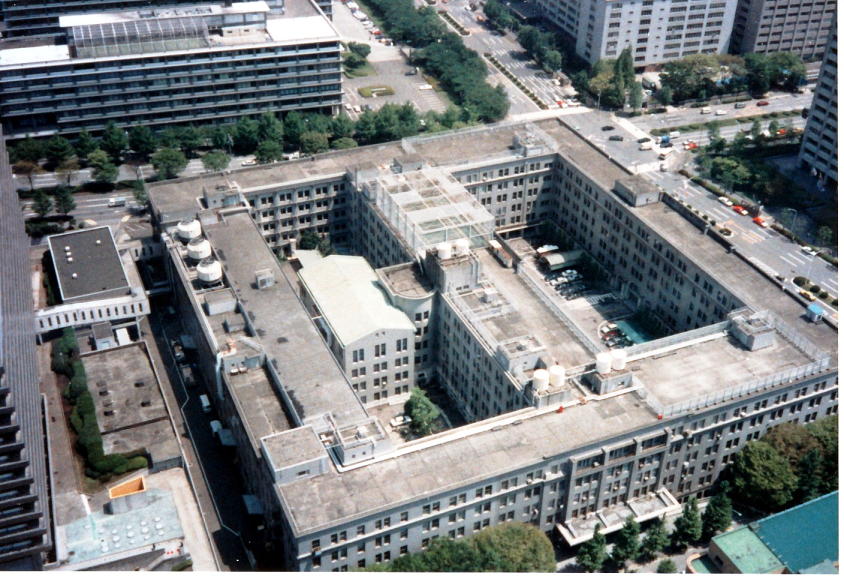 1970年の写真では大蔵省(現:財務省)の隣に合同庁舎5号館が建設中。その横にこの煙突がうつっていますが、1989年の大蔵省写真を見るとすでに煙突はありません。