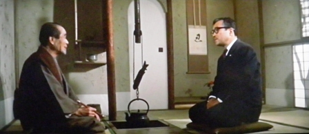 「続・サラリーマン忠臣蔵」天野化学社長・天野義平(左卜全)宅を訪れた大石社長(森繁久彌)と寺岡平太郎(小林桂樹)。