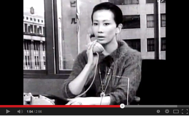 淡路恵子さんの後、窓から見える建物。左側は「その場所に女ありて」に登場する銀座東邦生命ビルに似ているけどちょっと違います。改装前の松坂屋にもちょっと似ています。