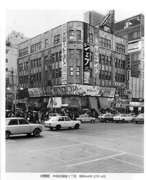 「日本一のホラ吹き男」と「続・若い季節」の床屋のロケ地は同じで、対鶴館ビル(中央区銀座5-4-3)横の並木通りだったのだとしていますが、床屋の入り口に模しているところは、当時の対鶴館ビル入り口です。一階が店舗で二階から上が事務所になっていました。