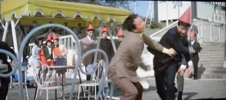 集団乱闘が発生しているプールサイド脇を、のんびり乳母車を押しながら歩く女性に当たります。
