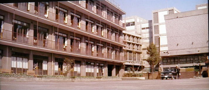 体育館(講堂?)の手前に校舎が出来てしまいましたが、航空写真で見るとこのあたりでも西側には、まだ低層の一戸建て住宅が残っているんですね。