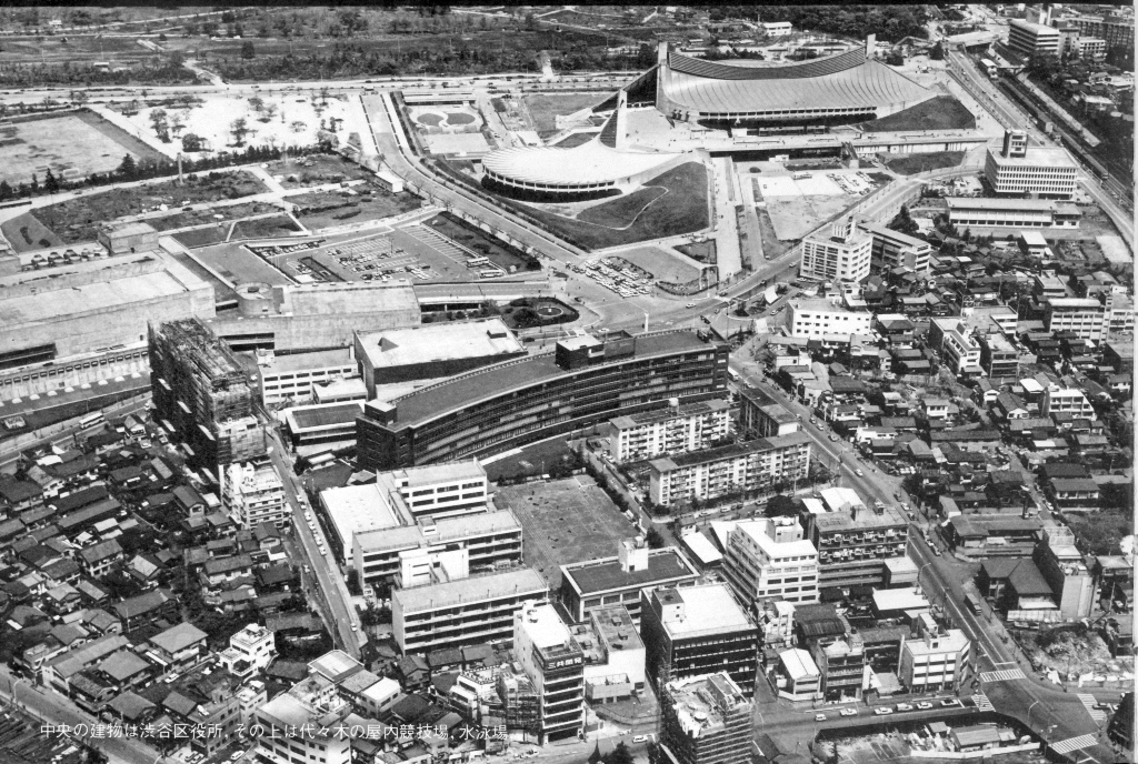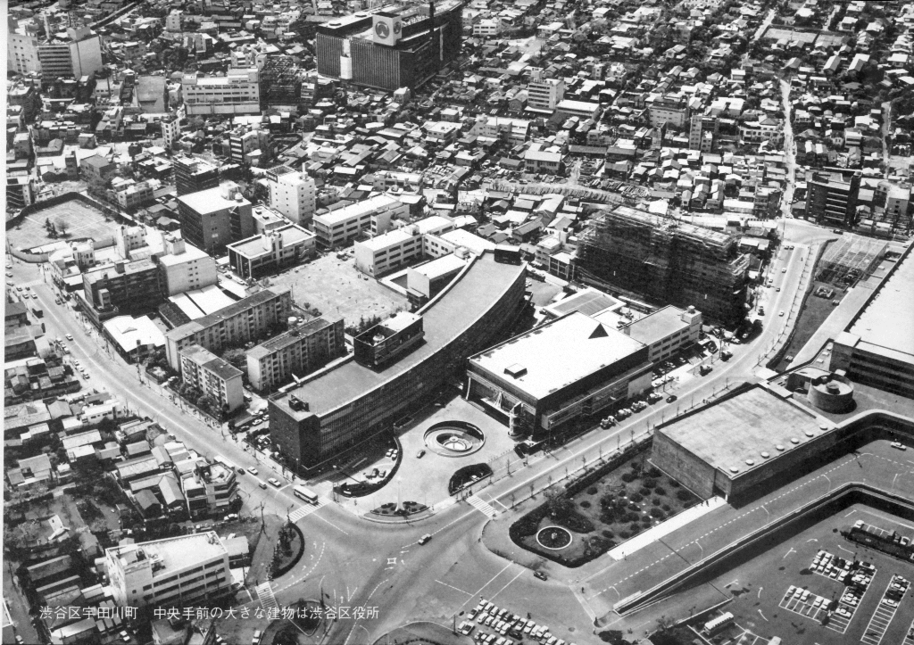 写真は共に1970年当時の渋谷区役所と公会堂(ノーベル書房「空の散歩シリーズ1 東京」より)